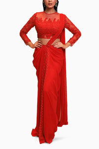 Bright Red Georgette Drape Saree with Full Sleeve Blouse