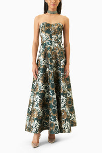 Introducing our off-shoulder statement brocade gown, a masterpiece of elegance and allure. This gown features a fit and flare silhouette that accentuates the figure, with a sweetheart-shaped neckline on the corset-inspired top for a touch of romance. Crafted from floral brocade jacquard in tones of green, white, and gold, it exudes opulence and sophistication. Padded for structure and comfort, it includes a hook and zip closure at the back for a seamless fit. For added versatility, the gown comes with adjustable, detachable straps, making it a perfect choice for glamorous occasions.