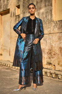 Ombre pattern structured longline boxy jacket in soft brocade. Graded tones of silver, blue and copper. Full sleeve, V-neck notch collar. 2 hammered metal silver buttons in the front. Garment is fully lined. Paired with matching wide-legged pants. Flattering silhouette with dramatic wide-legged detail. Worn at the high waist. Loop button and zip closure at the side. Garment is fully lined.