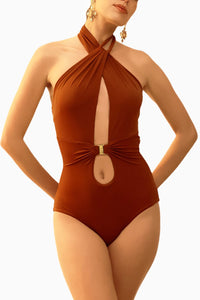 Featuring Bronze Apeiro Monokini by Tizzi's Sepia Garden Collection. Statement piece with crossover halter neck, bust & waist cut-outs, and gold trim detail. Crocheted strap detail adds oomph! Less Coverage with removable cups.