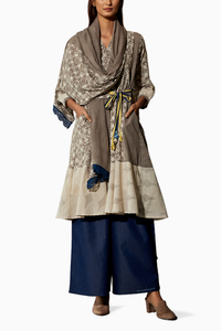 Featuring the Brown 24X7 Festive Coord Set by Jayati Goenka, a chic trio for all-day elegance. This three-piece co-ord set includes a brown block printed flared dress paired with ankle-length elasticated denim pants. Complete with a printed stole adorned with JG signature button knot details, crafted from natural dyed and handblock printed cotton blend fabric and denim.