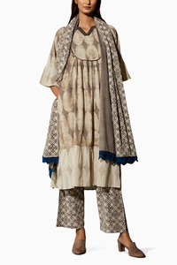 Featuring the Brown 24X7 Rooted Coord Set by Jayati Goenka, a chic trio for everyday sophistication. This three-piece co-ord set includes a brown printed tunic paired with ankle-length elasticated pants, adorned with JG signature button knot details. Complete with a printed stole crafted from natural dyed and handblock printed cotton blend fabric, offering effortless style in three components.
