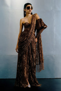 Featuring Brown Bead Embellished Sari Set with Accessories by CITARA’s Bridesmaid Collection. Crafted in lace with satin lining, this relaxed drape is adorned with delicate bugle beads, offering a soft yet glamorous finish.