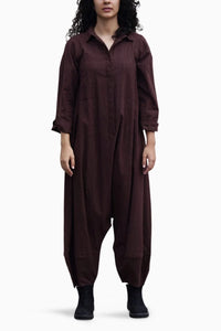 A sleek and easy to wear jumpsuit crafted in soft handwoven cotton fabric, featuring a sharp collar and front button opening for added ease. Designed for comfort and style .
