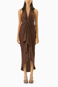 Featuring Brown Diana Dress in halterneck style. Draped in Satin, it has chain detailing on neckline and hanging in center front. It's backless with center back conceal zipper for closure.