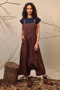 Strap dungarees with adjustable buttons on the straps. Made in handspun cotton comes with side pocket. Team it up with any contrast crop top from the collection to complete the look.