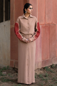 Featuring the Brown Loop Sleeve Comfort Shirt and Brown Front Button Up Comfort Trousers by Somya Goyal's Comfort Zone Collection, this co-ord set blends recycled PVC looped hand embroidery on kimono sleeves with versatile trousers that convert to an A-line skirt with front button closure and belt loops, offering a stylish, functional, and comfortable outfit.