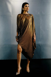 Featuring Brown Lurex Relaxed Fit Drape Dress by CITARA’s Bridesmaid Collection. Designed in shimmering lurex, this relaxed drape dress sparkles with crystals and bugle beads, creating a fluid, modern-glam look.