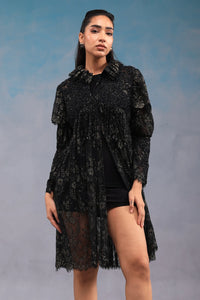 Dramatic, decadent, and exquisitely detailed — the Midnight Tapestry Daphne Fringe Dress is crafted to make a statement. Featuring intricate black beadwork across the yoke and delicate gold-threaded tapestry lace throughout, this piece blends richness with fluidity. The cascading beaded fringes add captivating movement, creating an effortless sense of glamour with every step.