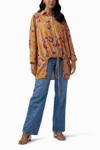The brown anaar jaal ochre print crepe shirt tunic is a captivating piece that blends traditional patterns with contemporary style. Crafted from soft, breathable crepe, this tunic features an intricate anaari jaal design with a rich ochre print, offering a warm, earthy tone perfect for both casual and semi-formal occasions. The relaxed, shirt-style tunic has a flattering, flowing silhouette that provides comfort without compromising on style