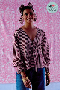 Pune top is designed using striped cotton fabric. It features self-tie bows at the front, a peplum hem, full sleeves, and has a relaxed fit.