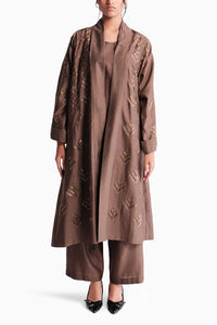 This exquisitely crafted kimono jacket showcases intricate appliqué work, beautifully complemented by rich zari detailing along the collar panels and sleeve cuffs. It is paired with flared Hakama pants and a silk Chanderi top, lined with cotton, creating a perfect blend of luxury and comfort for a refined, elegant look.