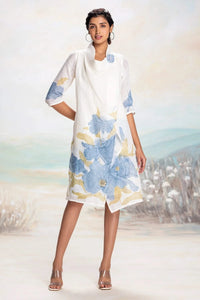 A stylish jacket dress featuring a cascading shawl collar and 3/4 sleeves. Hand-screen printed with blobs of paint, the design creates an artistic elegance with abstract floral patterns that gracefully flow along the hem and sleeves. The soft hues of blue and pink add a vibrant yet refined touch, making this piece a modern and chic statement for any occasion.