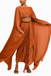 This unique crop top and draped skirt set combines modern sophistication with edgy details. The solid crop top features a boat neckline and offbeat full-length sleeves, accented with leather belt details and a belt at the hem. The skirt boasts pleats, a belt at the waist, and an asymmetrical hem, while the zip closure ensures a sleek fit. Perfect for making a bold statement with its stylish and contemporary design.