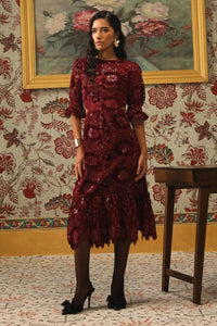 Burgundy Glimmering Cutwork Applique Midi Dress