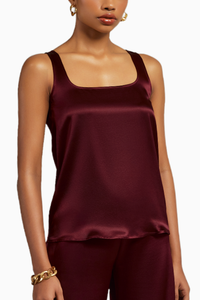 Featuring the Burgundy Silk Camisole by Refined Revolution. Indulge in luxury with this camisole crafted from 100% silk charmeuse satin. Its square-round neck offers a sophisticated touch, while sizing up ensures a relaxed fit.