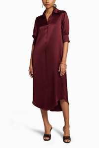 Featuring the Burgundy Silk Shirt Dress by Refined Revolution. Elevate your wardrobe with this elegant shirt dress, crafted from luxurious 100% silk charmeuse satin. Adorned with sophisticated shell-effect buttons, it offers versatility with the option to wear with or without a separate sash belt. Designed for a true-to-size, relaxed fit, exuding timeless charm and effortless style.