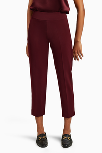 Featuring Burgundy Stretch Suiting Cigarette Trousers by Refined Revolution. These high-waisted trousers, crafted with 90% polyester and 10% elastane, offer both comfort and style. With a wide waistband and invisible side zip, they ensure a perfect fit.