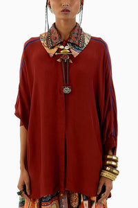 Discover the allure of our Burnt Amber Mandala Shirt. The solid-print straight shirt, crafted from natural crepe, boasts an embroidered collar with intricate zari marodi detailing. Embrace the anti-fit design and elegance.