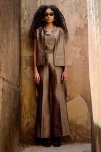 Featuring Burnt Bronze Crown Bib Set by Ritika Arya Jain's RAYA collection, a bronze metallic 3-piece set with a structured bralette, flared trousers, and a tie-up overlay, channeling futuristic femininity with bold, sculptural elegance.