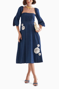 This denim calf-length midi tube dress is adorned with intricate hand embroidery, offering a touch of elegance. It features detachable 3/4th sleeves with slits and elastic for versatility. The contrast piping, stitch line detailing, and side pockets enhance its design, while the fit-and-flared silhouette ensures comfort and style.
