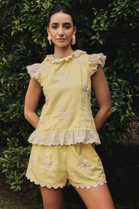 Crafted in butter cup yellow this co-ord set features a creame embroidered blouse with lace trims hand ruched back and back ties The matching butter cup yellow shorts with creame embroidery make this set a must have from The Golden Haze Collection.