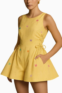 A light-as-air piece designed for sun-drenched days, this romper is crafted in a buttery-soft yellow pinstriped cotton. Its flattering flared silhouette features six thoughtfully placed pleats—along dart lines and side seams—giving it a playful skirt-like movement as you walk. The sleeveless style has a boat neckline in the front, a deep U at the back, and a discreet center-back zipper for closure. Finished with dual patch pockets and scattered hand-embroidered butterflies in candy-toned hues, it’s a joyful nod to summer freedom and effortless elegance.