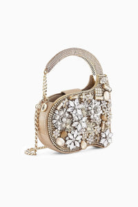 Material- Floral Stones Embellishment, Lining- Suede Color- Gold Details- Embellished Closure- Button Lock Dimensions- Bag (cm) 14.5*19*3.5 Product Code- SVEANAAAN-HB-020