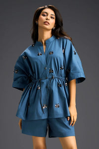 Fresh and effortlessly chic, this blue cotton co-ord set pairs a drawstring-waist shirt with tailored shorts for a relaxed yet polished silhouette. Detailed with delicate hand-embellished butterfly motifs, it adds a touch of artisanal elegance to your warm-weather wardrobe.