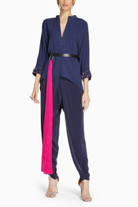 Crafted in crepe, the Butterfly shirt is fuss free and crush free. A super relaxed free size shirt with a flared hem. The cuffs on the shirt are hand embroidered with statement contrast stones which give just the right amount of bling. Pared with draped Lily Pants has an overlap panel on the front that creates an interesting shape. Flat from the back it has a waistband and a concealed zipper that closes on the side.