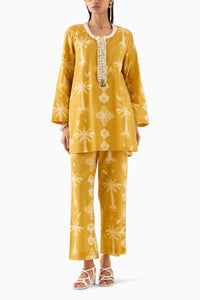 The Cabana Short Kurta and Pants crafted from our 100% cotton fabrication, trans-seasonal, is a statement piece. The kurta, made in our yellow palm print, is part of a 2 piece set. With a hand embroidered neckline, this kurta is lined and has full sleeves. Featuring a summery look, it has high slits. Paired with our Cabana printed straight pants with a side zipper, it looks chic. Wear it with heels for an elegant look.