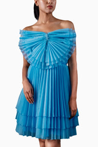 Featuring a stunning pre-pleated cabbage dress, this piece is crafted from ethereal organza, offering a light and airy feel. The dress is elevated by a dramatic fan structure on the bodice, adding an architectural and elegant touch. Intricate 3D gitch hand embroidery enhances the design with a layer of detailed, tactile artistry, creating a captivating focal point. The combination of the vibrant lime green hue and the sophisticated design elements makes this dress a striking choice for any special occasion or stylish event.