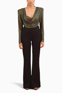 Featuring a cowl neckline adorned with multi-colored square-shaped Swarovski studs, the Cabella Co-ord Set from House Of Exotique is a statement ensemble. Complete with a Swarovski-embellished bralette and fit & flare pants, all in elegant black with heat press embroidery.