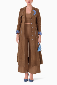 Introducing the Cabo Tan Nylon and Cotton Dobby Embroidered Trench—a sophisticated long jacket that blends style and functionality. This trench features beautiful embroidery on the sleeves, enhanced by floral appliqués and contrast stitch lines with piping details. With practical patch pockets and a detachable fabric belt, it offers versatility and ease. The easy fit ensures comfort, making this trench the perfect outerwear choice for any occasion!
