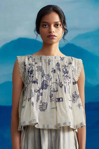 In a loose silhouette, our printed chanderi top features subtle pleating at the neck and shoulder, showcasing high-end tailoring. Versatile and relaxed, it pairs effortlessly with pants or denim for a laid-back look. Delicate lace detailing on the armholes and slip adds charm, while a side tie ensures a perfect fit. The soft silhouette and flared hem make it both chic and playful, perfect for bright summer days.