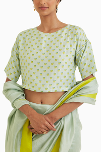 The Calm Seafoam Blouse features a sweet yellow rose print on a buttery soft mulberry silk base, in a seafoam hue. This t-shirt silhouette is perfect to pair with your elegant sarees.