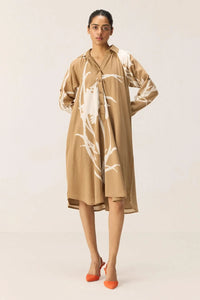 Featuring a versatile camel brown hue, this shirt dress is handcrafted in soft mul and adorned with an abstract white print on the front. Designed with classic collars, practical pockets, and a fully lined finish, it offers effortless style and comfort, perfect for relaxed day outings.