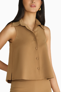 Featuring the Camel Stretch Suiting Sleeveless Top by Refined Revolution. Crafted with 90% polyester and 10% elastane, it boasts an oversized collar, fabric buttons, and an A-line fit with a back pleat. Size up for a relaxed fit.