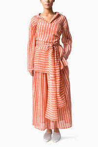 Effortlessly elegant, the Cami Wrap Coral Co-ord Set features a breezy button-down shirt and a flattering elasticated skirt. Crafted in coral red Dabu hand-block printed Chanderi silk, it is made in Bagru near Jaipur with a rich heritage of artisanal craftsmanship.