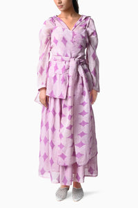 The Cami Wrap Plum Co-ord Set pairs a stylish cami wrap button-down shirt with a comfortable elasticated skirt. Crafted in deep purple Dabu hand-block printed Chanderi silk, printed in Bagru near Jaipur, it combines effortless elegance with traditional craftsmanship.