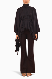 Featuring a stylish blouson top with adjustable hem and fabric belt for a cinched waist, the Camie Co-ord Set from House Of Exotique exudes sophistication. Paired with tailored fit & flare pants, both crafted from luxurious satin and crepe in timeless black.