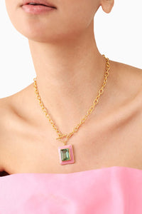 A standout piece of utmost simplicity where a green amethyst is embedded upon a pink enameled square, the Camilla necklace adds that pop of color to any ensemble to amp up your fashion game.