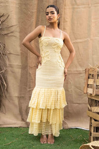 Introducing Camille, a stunning fitted butter yellow maxi dress that exudes elegance and sophistication. This knitted dress is beautifully adorned with monochromatic hand-embroidered braided flower work, adding intricate detail to its sleek silhouette. The tiered bottom, made from sheer checkered fabric, brings a touch of lightness and movement, creating a perfect blend of texture and grace. Camille is the ideal choice for a chic and timeless look.