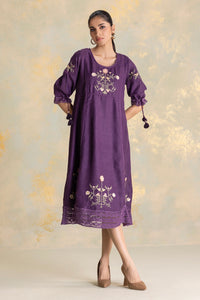 Candlelit Blooms Bed of Roses Dress is crafted in a breathable linen blend, featuring a round neckline, defined waist, and puffed 3/4 sleeves finished with bow-and-tassel detailing. Accented with lace inserts, a broad lace hem, and intricate center-front embroidery with balanced panel motifs, it offers a comfort fit with refined femininity for festive and daytime occasions.