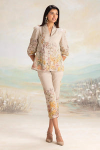 Featuring the Candy Blossom Tree Co-ord Set in 100% linen, this comfort-fit ensemble includes an elegant collared ‘V’ neck top with puff sleeves and delicate lace cuffs. Hand screen-printed with layered blossoms in vibrant hues, it offers a fresh, stylish look with digital print-like detailing.