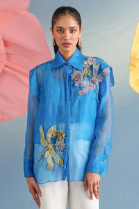 In a delicate candy blue, the Iris Shirt set features a sheer organza shirt layered over a soft crepe inner. Crafted from pure silk organza and imported crepe, it is adorned with whimsical 3D floral appliqué and dragonfly motifs — adding a touch of enchantment to its airy silhouette. A poetic blend of elegance and charm, perfect for day-to-evening transitions.