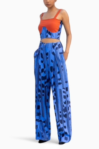 Introduce a bold and playful element to your wardrobe with our Candy Scribble Corset Set. This contemporary crop top and wide leg pants combo brings a youthful and stylish touch to any summer outfit. In vibrant orange and cobalt blue, this coordinated set is perfect for making a statement while staying on trend. Top Length: 15 inches Pants Length: 44 inches