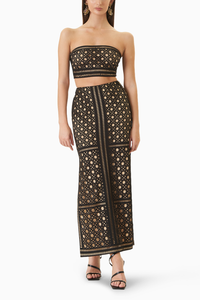 Black two-piece bandeau and skirt set featuring an exquisite allover rattan inspired laser-cut pattern. The garments have an allover caning pattern with strategically placed geometric borders. Bandeau bralette that has a solid stretch knit panel in the back. Paired with straight skirt has knee-high slits and a button-and-zip closure on the wearer's left. The skirt is fully lined, whereas the bandeau top is lined at the front with a contrast nude-colored rayon lining to highlight the caning cutout pattern.