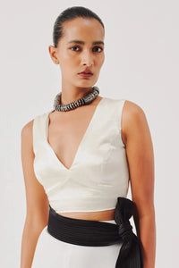 Featuring the Canopy Clouds Blouse in Ivory from Aroka's Signature Collection, a sleeveless blouse crafted in rich black vegan mashru with a subtle sheen. Designed in a fitted silhouette to contour the body, it features a clean V-neckline and is finished with a sleek back zipper for a refined, polished look.