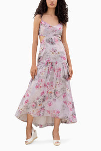 Can't help falling in love is a floral maxi dress that has a deep squared neckline covered with hand pleating detail on the bust. The waist has cutouts on both sides. The dress has an arched and fitted torso panel to which the gathered skirt is attached with a light ruffle detail. The dress has noodles straps that crisscross at the back and a side zip for closure. The top bodice is crafted out of satin.